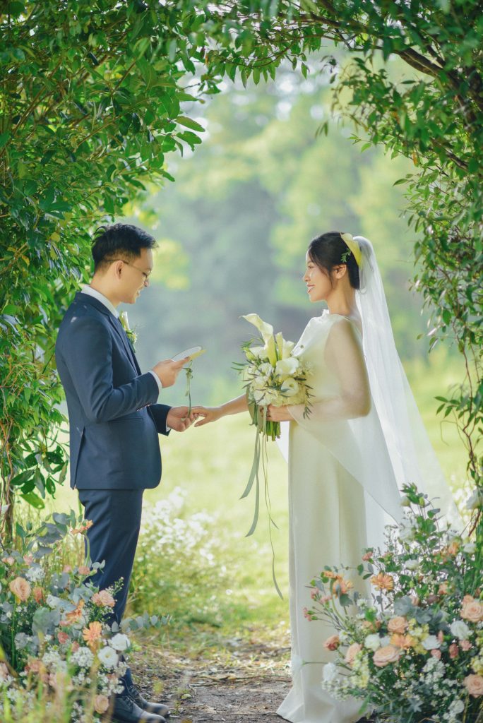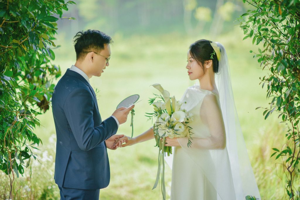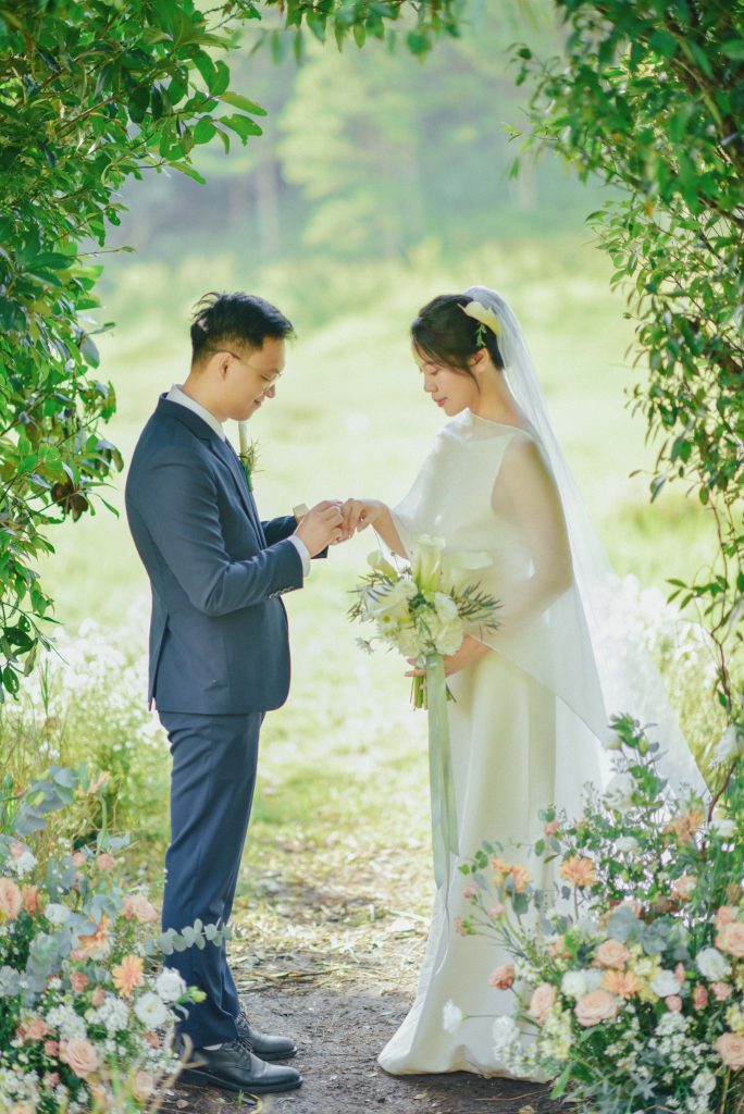 Hai người trao nhẫn cưới cho nhau dưới sự chứng kiến của đất trời Đà Lạt